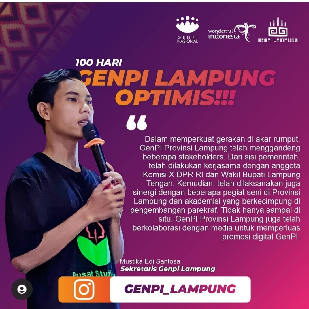 Kami berharap, 6 program prioritas GenPI Provinsi Lampung di tahun 2021-2022 dapat terealisasi dengan baik dan mampu memberikan sumbangsih positif bagi tumbuh dan berkembangan sektor parekraf di Lampung. Selain itu, kami terus mendorong dan mengajak masyarakat dan para stakeholders untuk berpartisipasi dalam merealisasikan program-program kami ke depan.